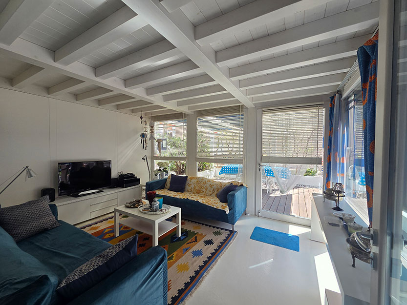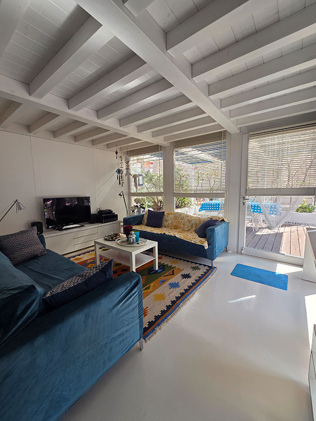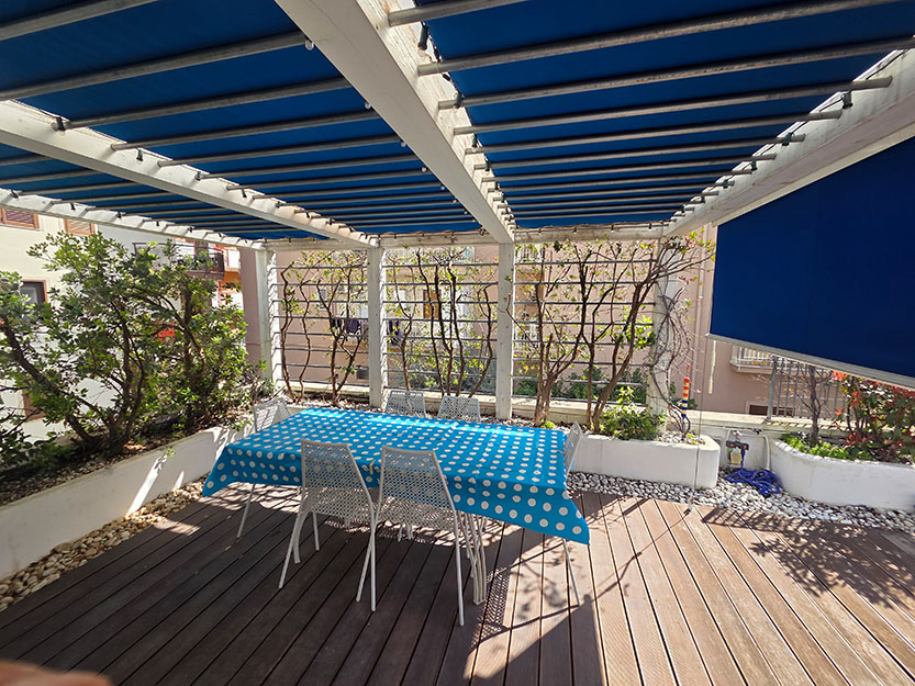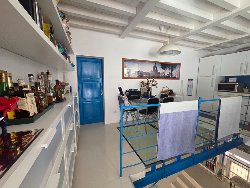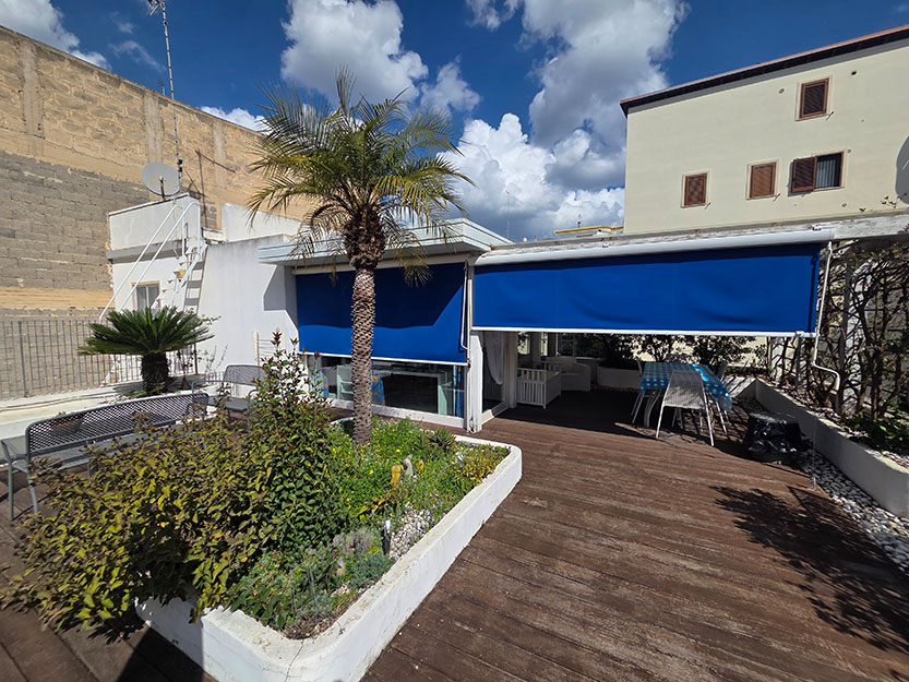 • AMPIA TERRAZZA SOVRASTANTE CON DOPPIO ACCESSO ESTERNO E INTERNO, STILIZZATA CON FIORIERE IN STILE MEDITERRANEO, GIÀ FORNITA DI PIANTE, RAMPICANTI E ARBUSTI DA FIORE CON IMPIANTO DI IRRIGAZIONE FUNZIONANTE, DOTATA DI IMPIANTO DI ILLUMINAZIONE NOTTURNA, ATTREZZATA CON ARREDAMENTO COMPLETO PER ESTERNI (TAVOLO, SEDIE, DIVANI, POLTRONE E OMBRELLONI CON CUSTODIA E CORRISPONDENTE ALL’INTERA SUPERFICIE DELL’ABITAZIONE, SULLA QUALE INSISTONO PERTINENZE DI RECENTE RISTRUTTURAZIONE IN PURO STILE CICLADICO DAI TONI BRILLANTI DELL’AZZURRO, COMPOSTE DA UNA CAMERA DA LETTO MATRIMONIALE CON BAGNO, CUCINA ARREDATA ACCESSIBILE DA UN PAVIMENTO PENSILE IN SPIDERGLASS, UNA TETTOIA E UN PERGOLATO, IDEALI PER VIVERE MOMENTI DI RELAX ALL’APERTO. PAVIMENTI E SCALA DI ACCESSO AL PIANO SUPERIORE RIVESTITI CON RESINE COLOR BIANCO;